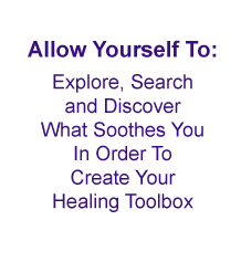 It is my desire that this website, (along with the You Tube Videos), will inspire you to discover your needs and create your own arsenal of tools. Let go of judgment, the old tapes of yester year that continue to play in your head about not being creative or a good enough artist, musician, athlete, etc.   Allow yourself to explore, search and discover what soothes you in order to create your healing toolbox.
